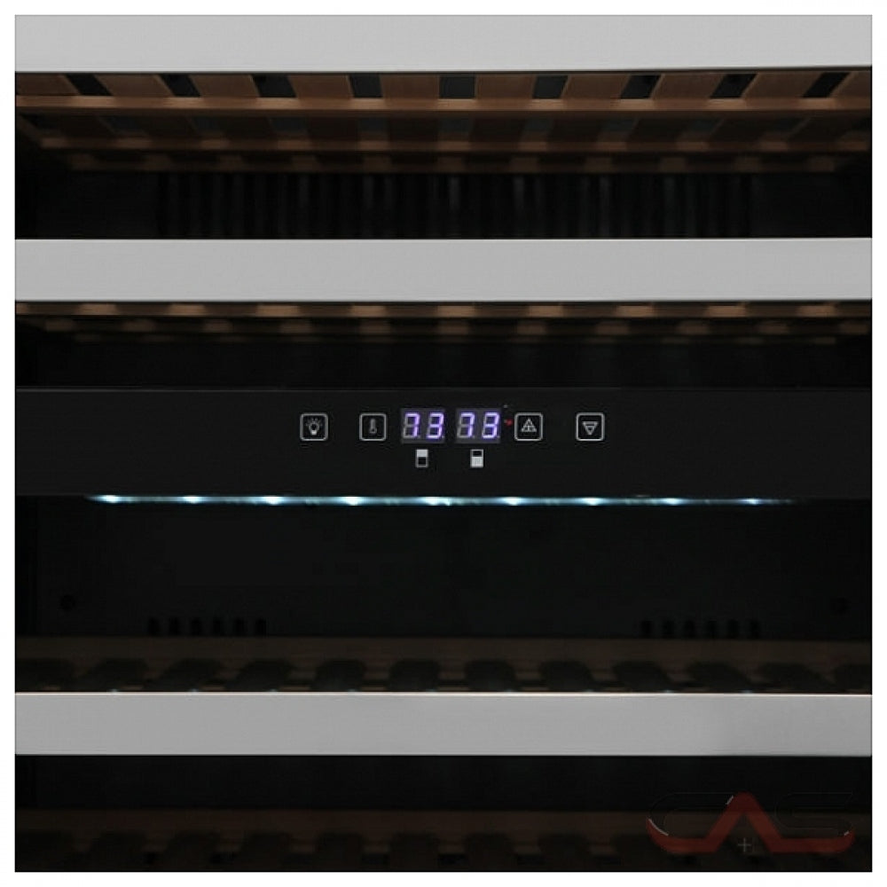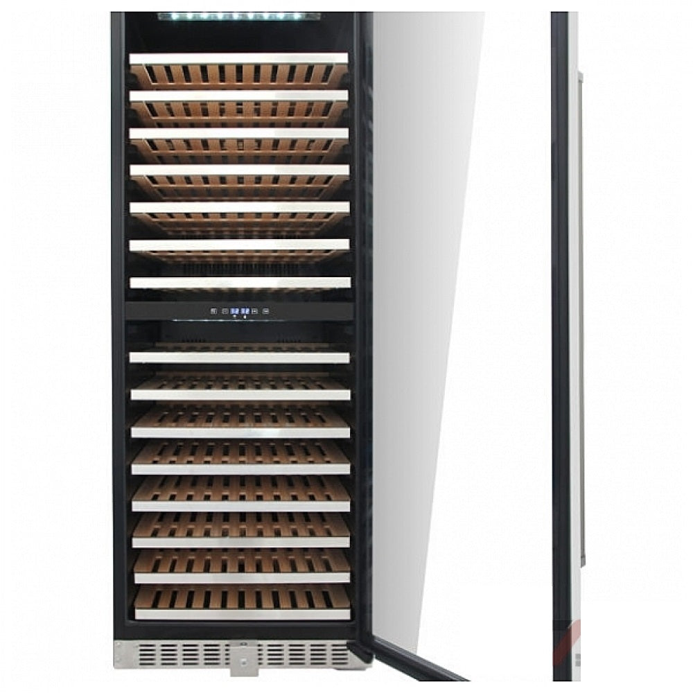 A dual zone wine and beverage cooler featuring 156-bottle storage capacity, reversible door, touch control pad, and LED lighting. Capacity: 156 Bottles Dual zone Built-in & free-standing installation Wooden shelves White LED Interior Light with switch Tempered double pane glass door Reversible Door Touch pad digital control with blue LED readout Energy efficient design.