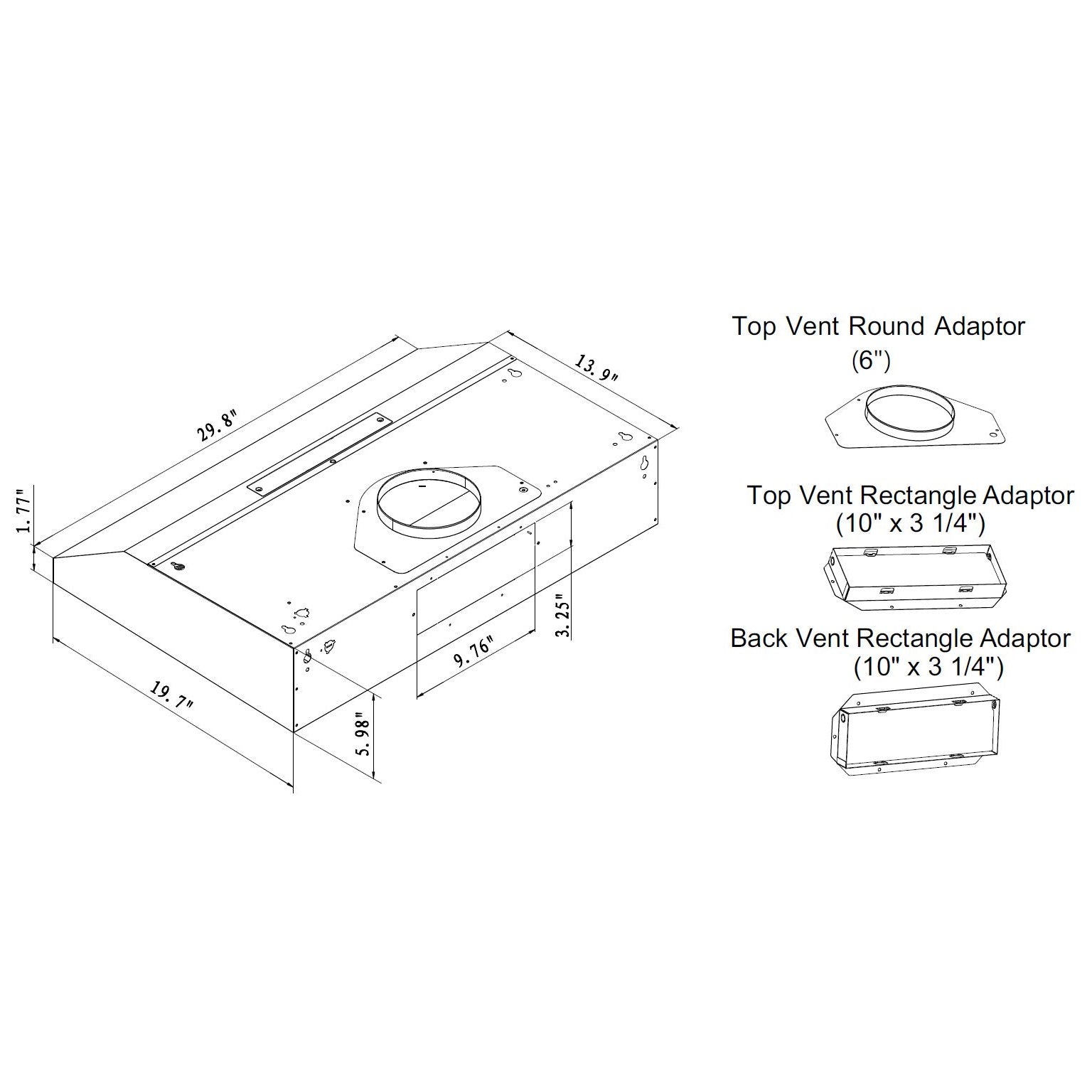 - Range hood comes with 1-year manufacturer warranty on all parts. Dimension are 29.80" X 19.70" X 5.90"