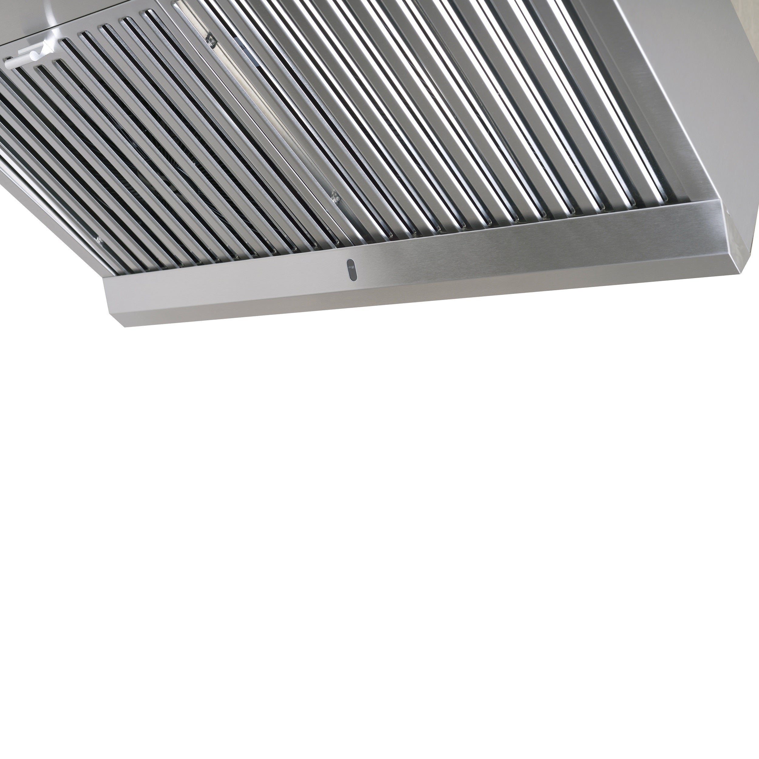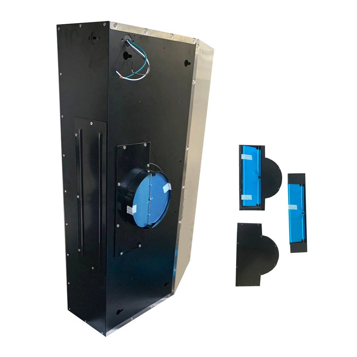 The chosen level of extraction is indicated by an Intelligent LED light, to make it easier to know what level has been chosen. The grease collection pan and cups may be removed, washed, and put back. Features vents from the top with 6" circular and 10"X 3.75" rectangle and also a back vent 10"X 3.75" rectangle duct.