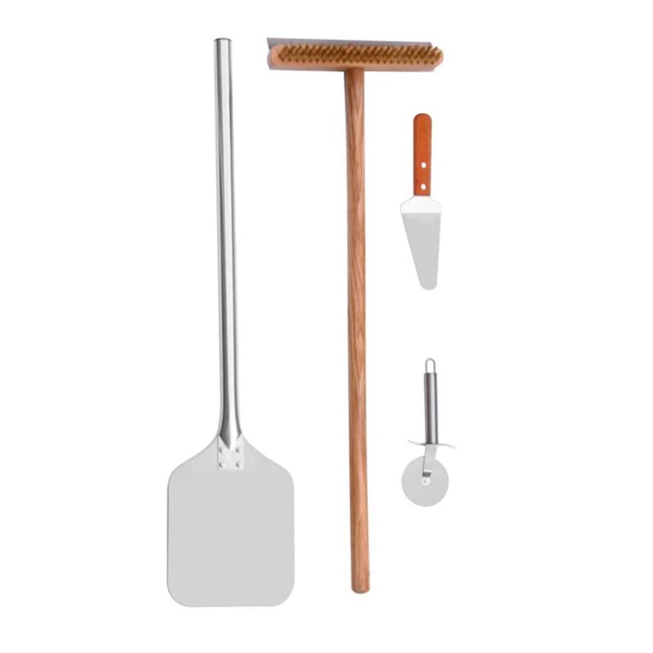 - Includes pizza cutter, wooden handle pizza server, stainless steel pizza shovel, and cleaning brush