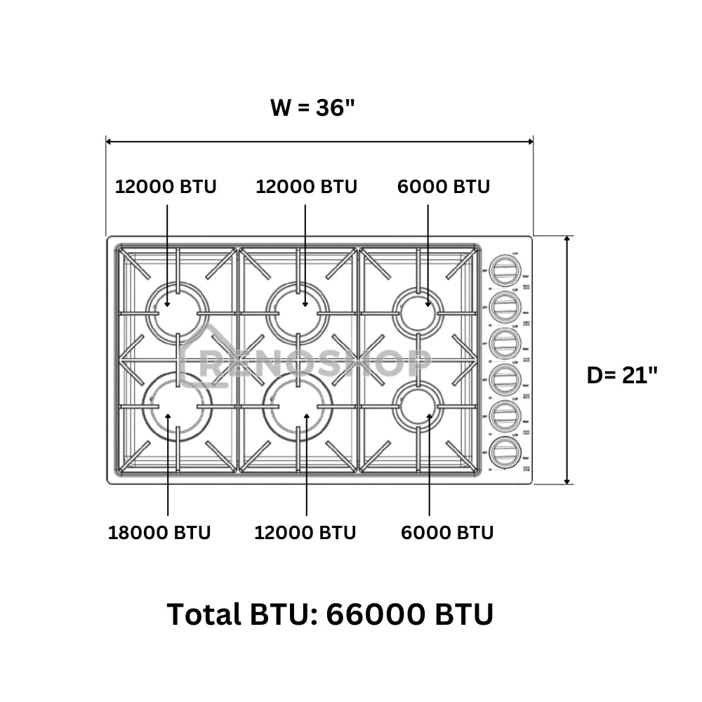 - Outside(Max.) Cooktop Dimension: 36”W X 21”D X 4 2/5”H